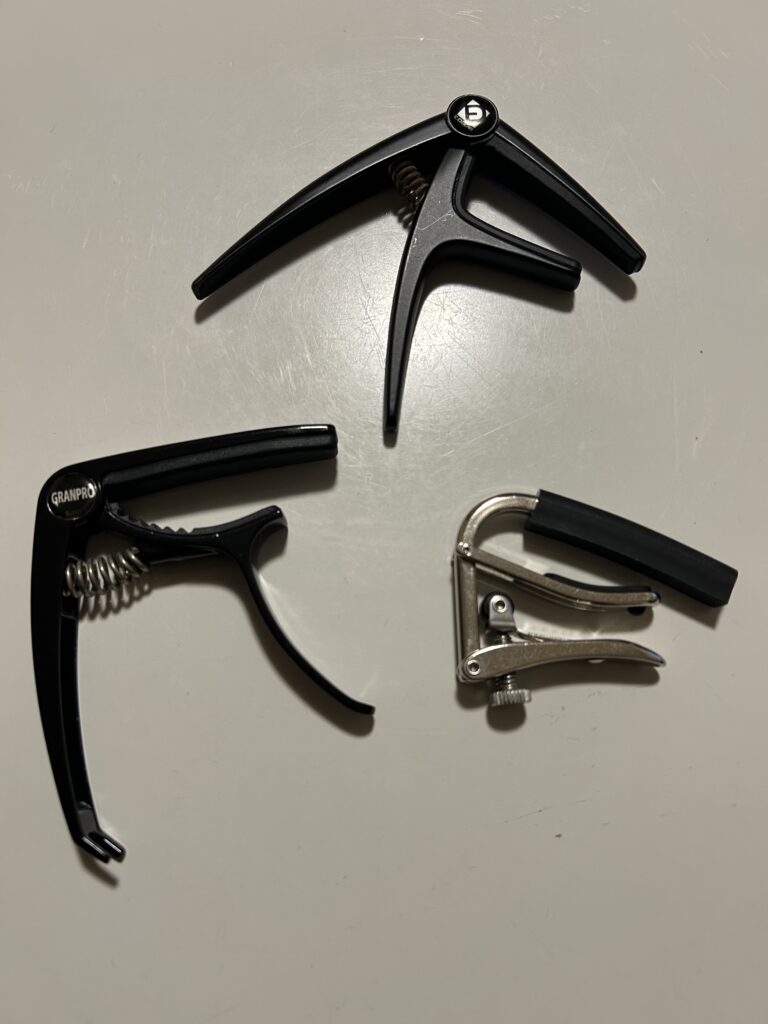 カポタストとは、ギターのネック(左手の弦を押さえる部分)に挟んで使用する道具です。移調(キーを変える)ために用います。