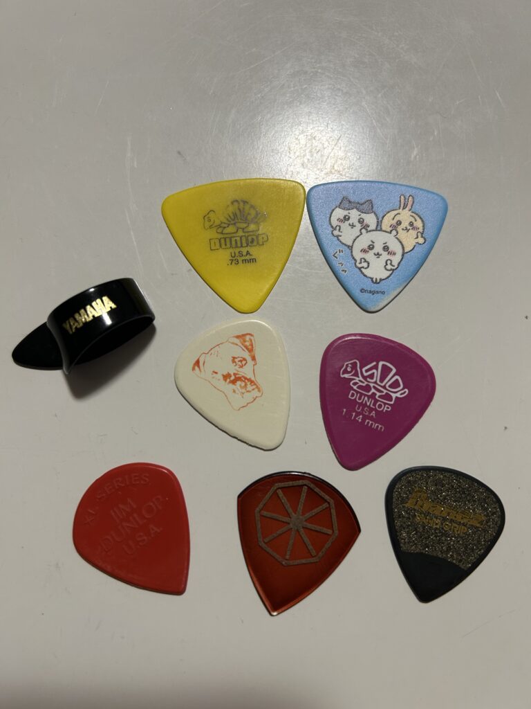 ピックにも種類がありますが、アコギであれば正三角形のトライアングル(おにぎり)型のものを選ぶと良いでしょう。(この写真で言えば黄色いものとちいかわのピックがトライアングル型)