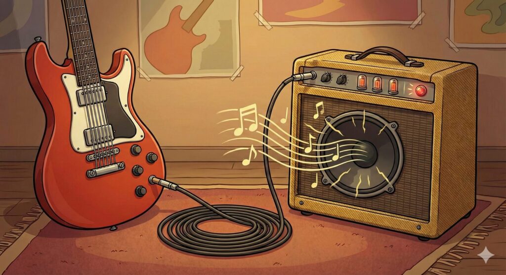 弦の振動をピックアップと呼ばれるマイクで拾い、アンプを通して音を出す楽器です。